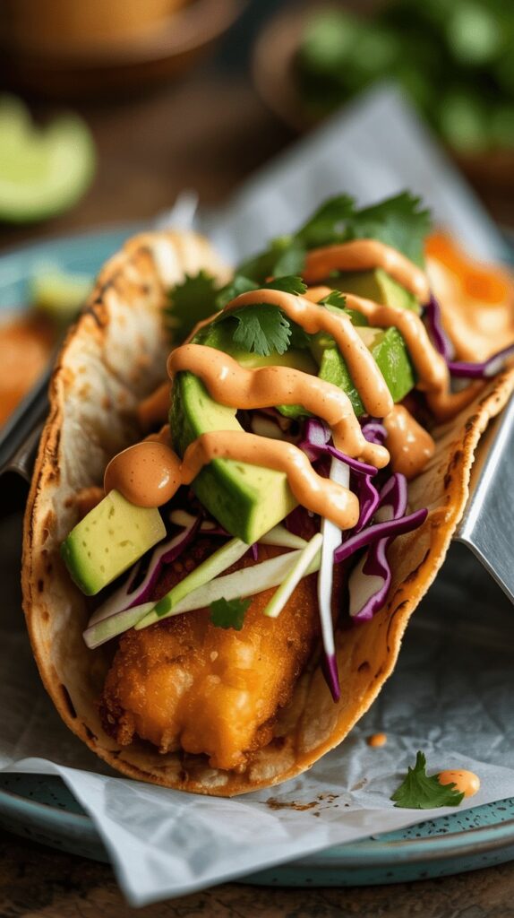 - Assemble the Tacos: Warm the tortillas in a dry pan. Place a piece of fish on each tortilla, top with shredded cabbage, diced avocado, and cilantro. Drizzle with your favorite sauce before serving.